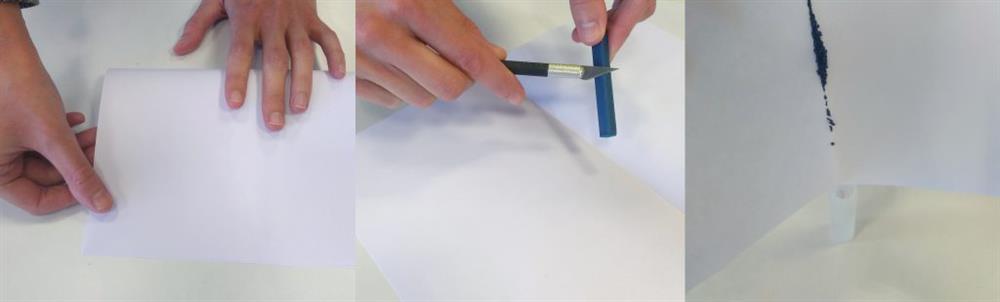 Brett papiret i to som på bildet. Bruk en skalpellkniv for å barbere et Inktense kritt forsiktig på papirret til du har en sjenerøs mengde med pigment å jobbe med. Jo mer krittstøv du lager, desto mer intens vil fargen bli. Putt krittstøvet forsiktig ned i en spritzer som er ferdigfylt med vann. Sett lokket på spritzeren og rist kraftig til alt av krittet har løst seg opp i vannet.