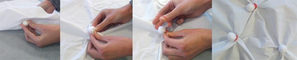 Plasser en klinkekule etc. under stoffet og bind en gummistrikk rundt den fra den andre siden. Hvis du ikke vil bruke disse, kan du bare klemme stoffet i stedet, og binde gummistrikken rundt. Jo større område som bindes, jo bredere blir de særegne fargesirkelene. Gjør dette flere ganger over stoffet der du ønsker at sirklene skal vises.