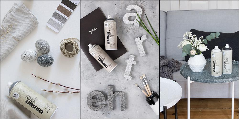 Dette er en vannbasert effektspray med fine plastpartikler som gir en realistisk granitt effekt. Kan brukes på en rekke ulike underlag, kartong, grunnet lerret, tre, glass, metall, keramikk, porselen, sten, akryl og andre malbare materialer. For optimalt resultat anbefales at underlaget grunnes, spesielt om du bruker lys Granit Effect på mørkt underlag. Granit Effect tørker sent om du legger flere lag (opptil 24t), og den kan overmales med spraymaling eller en topplakk/ferniss.