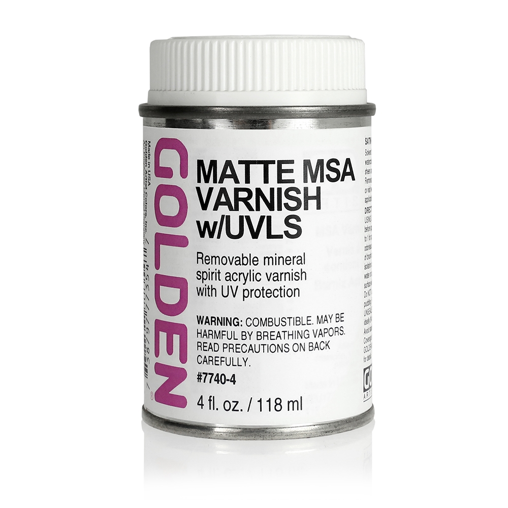 En akryl harpiks på mineralsk terpentin basis. MSA ferniss danner en hardere, mindre gjennomtrengelig overflate enn de vannbaserte akryl emulsjon fernisser. Den hindrer i høyere grad støv og smuss i å trenge ned i overflaten og legger seg som et meget jevnt, beskyttende lag over eventuelle ujevnheter. Kan, når den er tørr, fjernes med mineralsk terpentin. Kan brukes både utendørs og innendørs. Fås som GLOSS, SATIN og MATTE. UEGNET FOR BARN.Finnes både som spray og i flytende form.Golden fernisser er avtakbare, beskyttende produkter som er laget for å beskytte og muliggjøre renhold av malerier. Alle gir en beskyttelse mot ultrafiolett stråling.Viktig: Før du går i gang med fernissering, prøv på et bilde av tilsvarende utførelse som det du vil fernissere.Viktig: Vent minst 12 mnd. før du fernisserer et oljemaleri. Vent minst 1 mnd. før du fernisserer et akrylmaleri.