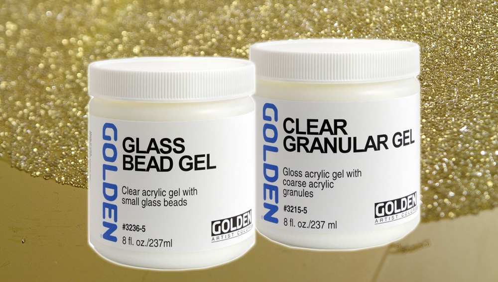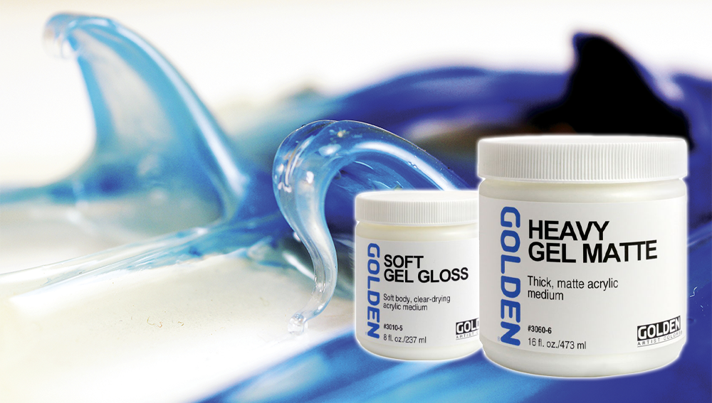 Golden Gel Mediums gir deg mange ulike måter å bygge tekstur på. Golden Gel medium finnes i fem konsistenser, fra myke Soft Gel til den tyktflytende Extra Heavy Gel. Hver gel er tilgjengelig i gloss, semi-gloss og matt. De kan brukes til å lage laseringer, forlenge/strekke malingen og endre finish.