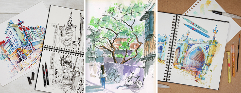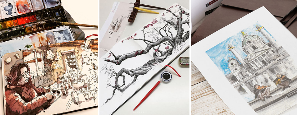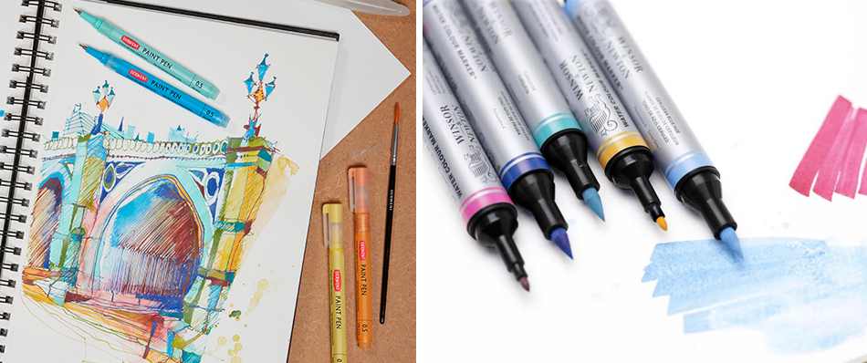 Mange bruker akvarell eller vannløselige fargeblyanter eller tusjer til Urban Sketching. Dette gir et mykere og mer tilfeldig uttrykk. Vi har en skissebok med akvarellpapir fra Hahnemühle, men om du ønsker en blokk hvor du kan rive løse papirene er det lurt å velge enten en akvarellblokk eller en mixed media blokk.