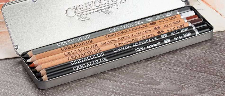 Et basissett med kunstnerblyanter fra Cretacolor. Inneholder: Sanguine, Sepia, White pastel, Charcoal, Nero og Graphic Aquarell 4B.