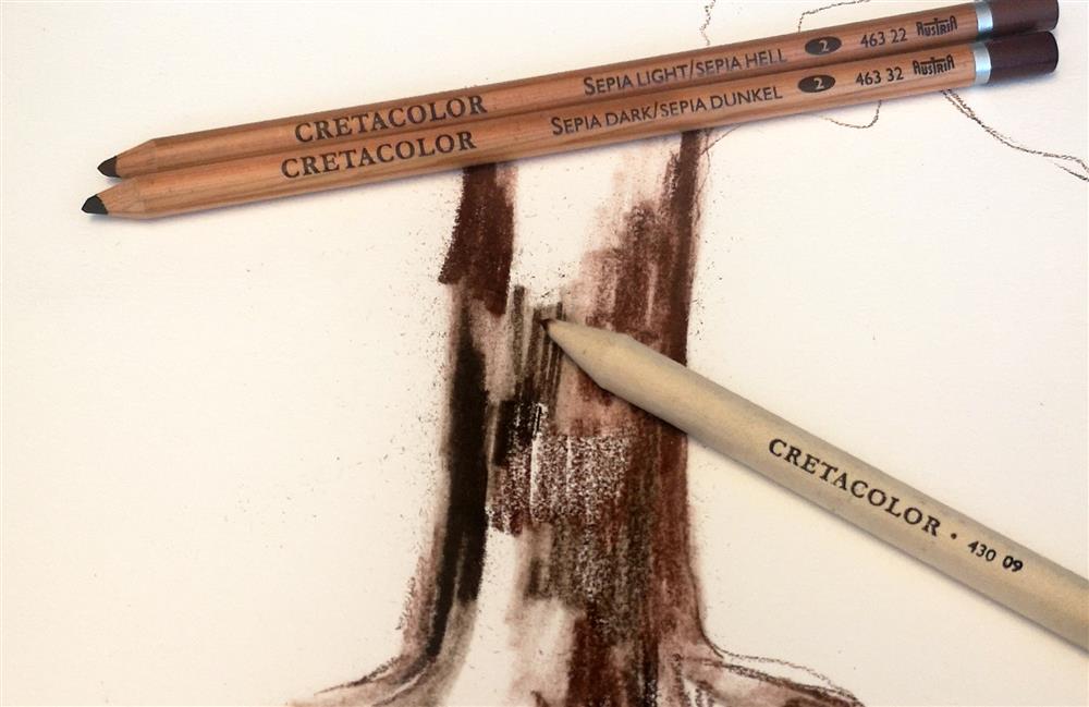 Sepia Dry Dark fra Cretacolor er en kunstnerblyant med mine av tørt mørkebrunt kritt, og Sepia Dry Light fra Cretacolor er en kunstnerblyant med mine av tørt lysebrunt kritt.
