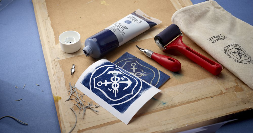 Når designet er ferdig utskåret tar du litt Lefranc & Bourgeois maling i ønsket farge på et malebrett. Se alle våre 12 farger i nettbutikken.