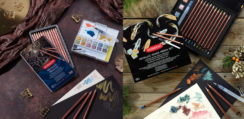Metallic fra Derwent er en vannløselig fargeblyant med metallisk effekt. Blyanten finnes løst i gull og sølv, og i sett med 12 farger. Derwent Metallic egner seg aller best på mørkere bakgrunner.