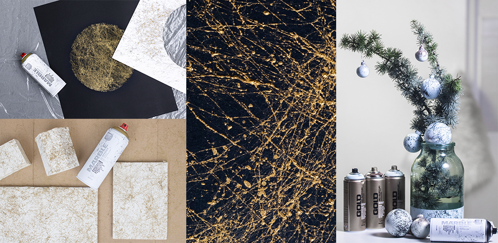 Marble Effect fra Montana er en dekkende spraymaling som gir en kul marmoreffekt. Den kan brukes på en rekke underlag, som kartong, grunnet lerret, tre, glass, metall, keramikk, porselen, sten, akryl og andre malbare materialer. Hva med å dekorere pakker eller lage egne julekuler? Du kan også enkelt lage dekorativ kunst på papir eller lerret å gi bort i gave! Før bruk må sprayboksen ristes godt, og du regulerer tettheten på marmorstrukturen med avstand fra materialet. Jo nærmere du sprayer, jo tettere bli mønsteret. I tillegg til julefarger i gull, sølv og rød, får du sprayen i blå, sort og hvit.