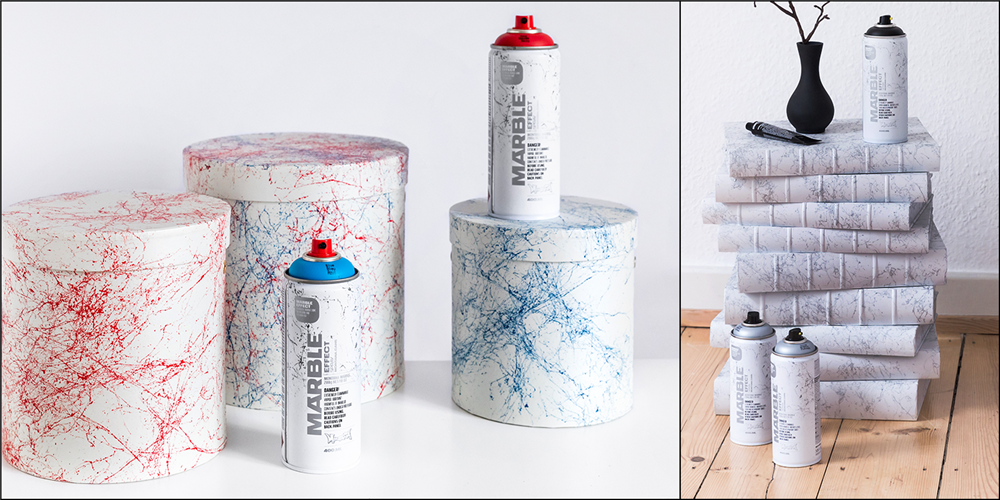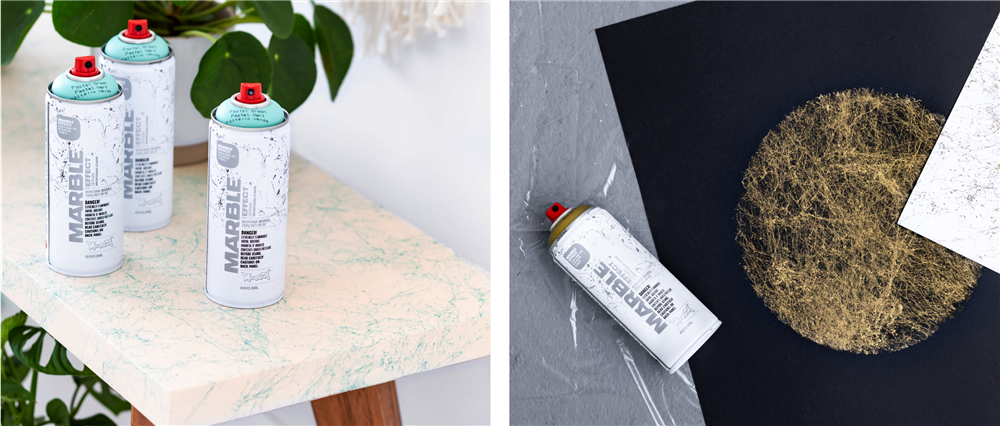 Dette er en dekkende spray som gir en kul marmoreffekt. Kan brukes på en rekke ulike underlag, kartong, grunnet lerret, tre, glass, metall, keramikk, porselen, sten, akryl og andre malbare materialer. Du regulerer tettheten på marmorstrukturen med avstand til materialet. Jo nærmere du går, jo tettere blir mønsteret. Sprayen kommer med en vridbar «kalligrafi»-dyse som gjør at du velger om sprayen kommer vertikalt eller horisontalt. Når marmoreringen er gjennomtørr kan du legge på en topplakk/ferniss.