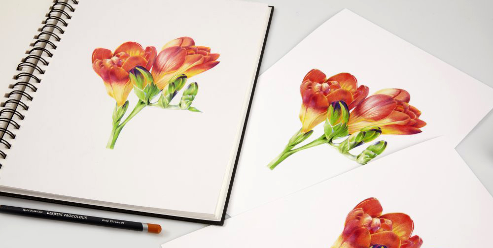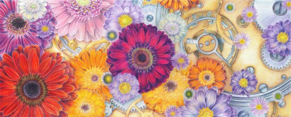 Still Life with Flowers and Time Piece av Cindy Wider, laget med Derwent Procolour fargeblyanter.