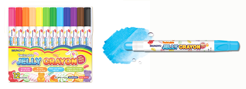 Mungyo Jelly Crayon er en ekstra myk vannløselig oljepastell for barn i 12 farger. Den kommer i et etui som gjør den enkel å holde for barn, og fargen kan skrus ut. Leveres i sett med 12 farger.