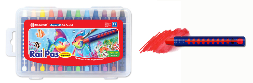 Mungyo RailPas er en kort, myk vannløselig oljepastell for barn i 12 farger. Den kommer i et etui som gjør den enkel å holde for barn, og fargen kan skrus ut. Leveres i sett med 12 farger.